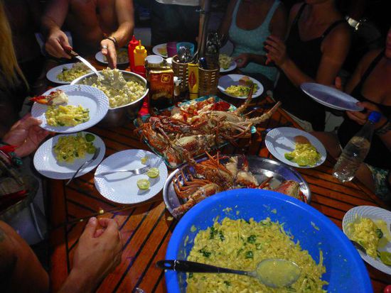 Täglich fahren wir zu einer anderen Inselgruppe. An den beiden letzten Tagen gibt es abends große frisch gefangene Langostinos, denen wir mit großen Hummerzangen zu Leibe rücken müssen.