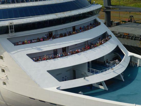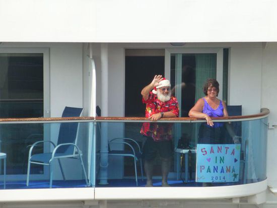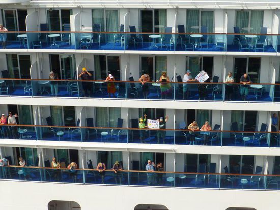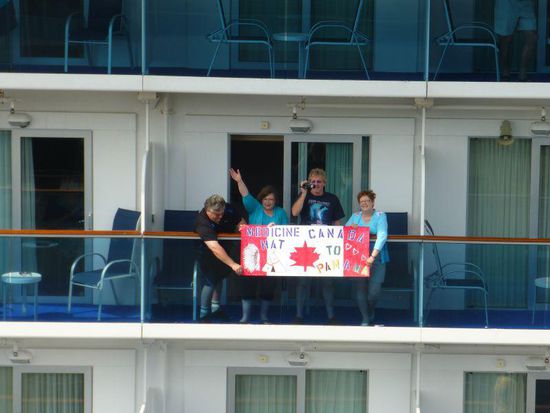 Die Passagiere stehen vor ihren Außenkabinen und halten selbstgemalte Schilder hoch, Kanada grüßt Panama usw. Vermutlich gab es an Bord einen Workshop "Wie bastele ich mir ein Schild?"