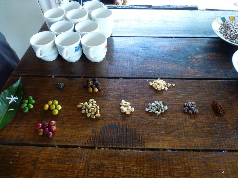 Zu guter Letzt werden getrocknete Bohnen extra für uns geschält, in der Pfanne geröstet und frisch aufgebrüht und wir dürfen raten, welches der 'tradicional cafe' und der 'moderno cafe' ist, sie schmecken in der Tat unterschiedlich! Timothy hat die Geschäftsidee, unter myowncoffee.com jedem 'persönliche' Kaffeepflanzen anzubieten, deren 'seine' Bohnen dann der Kunde auch erhält, auf Wunsch werden die Pflanzen dann z. B. auch jeden Tag eine Stunde mit Bob Marley Musik beschallt oder sonstwie individuell gepflegt.