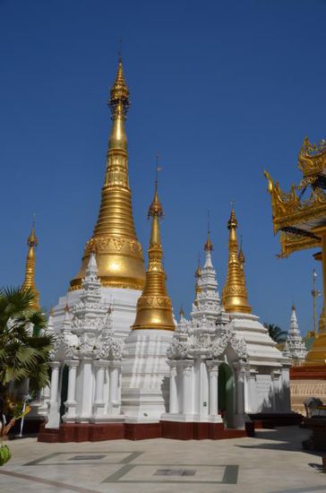 Wir haben uns heute auf den Weg zur bekannten Shwedagon Pagode gemacht - das bedeutendste Heiligtum des Landes und Pilgerstätte für Buddhisten aus aller Welt. Zu Fuß sind wir die 2,5 km dorthin gelaufen. Unterwegs wurden wir von 3 Jugendlichen angehalten und mit ihnen fotografiert. Sehr lustig: wir sind offenbar nicht nur ein Highlight, sondern auch ein begehrtes Fotomotiv. An das Anstarren und gelegentliche Ansprechen haben wir uns allmählich gewöhnt, aber das Fotografieren war bislang neu. Der Eintritt in den Pagodenkomplex kostete 8 US$. Schuhe aus und los. Die Pagode mit ihren 100 m Höhe und mit 9,75 t Gold verkleidet ist extrem beeindruckend. Die vielen kleineren Tempel und Hallen und Buddhas und Glocken sind allesamt sehr schön, aber die Pagode ist fantastisch! Es war ziemlich leer und es waren so gut wie keine Touristen dort. Sehr angenehm! Diese entspannte Atmosphäre hat uns recht lange dort festgehalten. Wir saßen im Schatten (in der Sonne war es kaum auszuhalten - besonders unsere nackten Füße haben auf dem heißen Untergrund gelitten) und ließen alles auf uns wirken.