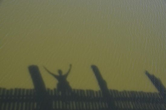 Die Brücke war extrem schlicht und wacklig. Ein Geländer gab es nicht und die Planken waren unterschiedlich breit und teilweise lose und von der Zeit "angenagt". Wir fragten uns, wie lange die wohl noch machen würde - aber offenbar ist sie robuster als sie aussieht. Die Umgebung war nicht sonderlich reizvoll. Es standen etliche Angler im Wasser, einige Kids badeten und das eine oder andere Boot war unterwegs - ansonsten war es recht ruhig. Der Aufmerksamkeit vieler der asiatischen Jugendlichen waren wir auch hier sicher und wurden daher mehr oder weniger heimlich fotografiert.
