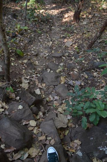 Der Morgen begann unerfreulich: Ulf wurde krank. Irgendwas in seinem Essen war wohl doch nicht so gut und er blieb im Bett und versuchte möglichst schnell wieder auf die Beine zu kommen. Uta machte sich also allein auf den Weg zum Popa Taung Kalat. An der Rezeption gab es eine Karte und auf die Frage nach dem "shortest way" den Hinweis, dass dieser den Berg hinab verläuft und zwischen dem Pool und der Bar beginnt. ??? Da war kein offizieller Weg - nur bei näherem Hinschauen war ein schmaler Trampelpfad zu erkennen. Nun gut - auf geht's! Es war tatsächlich nur ein Pfad, der durch den Wald führte, teilweise über Steine und Geröll. Bei jeder Gabelung des Pfades hingen entsprechende Hinweisschilder auf das Taung Kalat.