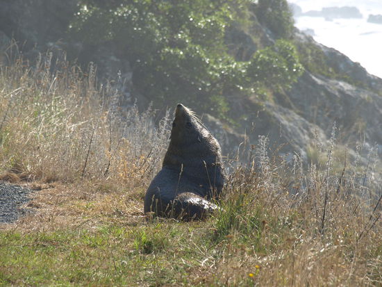 Warum hier kein Schild stand: Vorsicht Robbe am Straßenrand - jedenfalls hatte diese Robbe den höchsten Liegeplatz und die beste Aussicht
