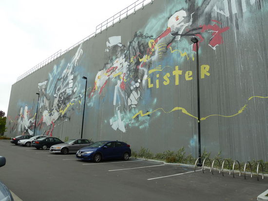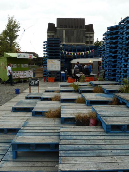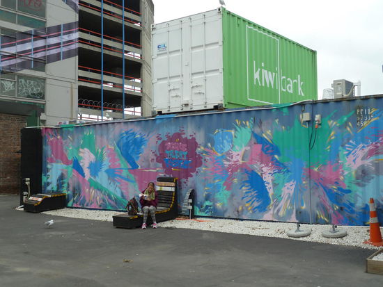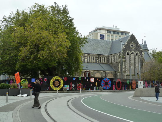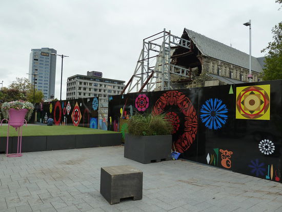 Die Kathedrale am Catheadral Square - Das Kirchenschiff wurde komplett zerstört und noch nicht wieder aufgebaut, aber die Bauzäune wurden nett gestalltet und auch die Sitzgelegenheiten sind "anders"