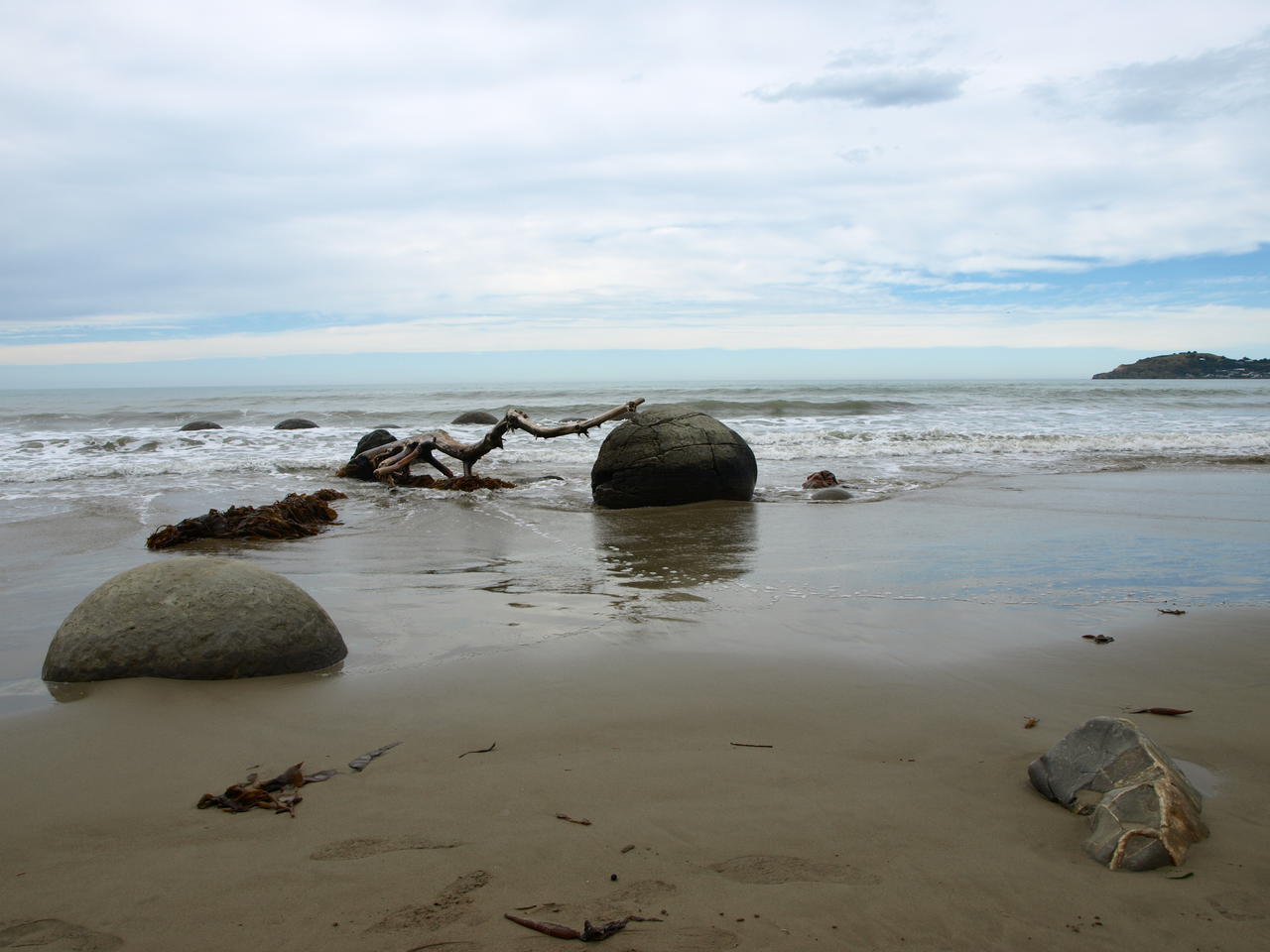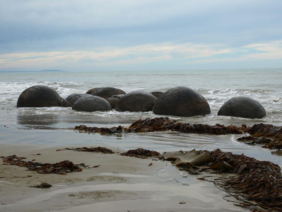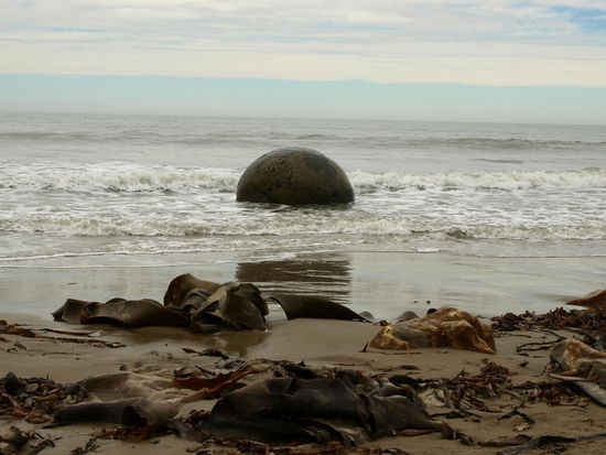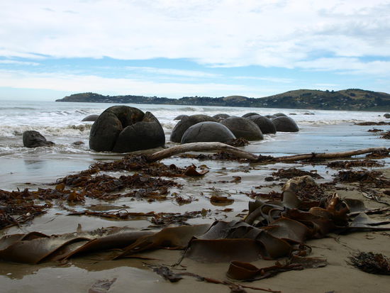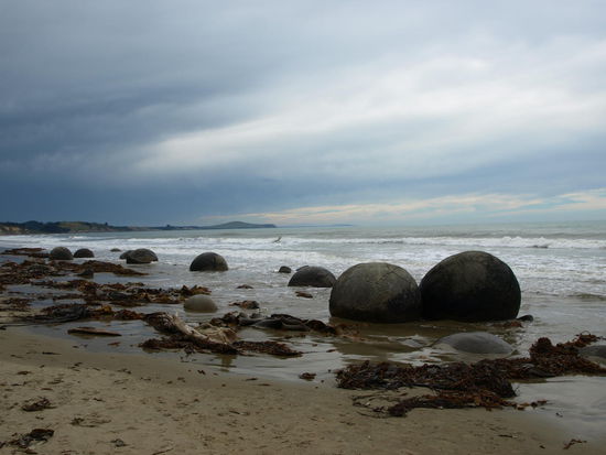 Es wurde auch nichts mit meinen Gelbaugenpinguinen, aber das hatte ich mir schon so gedacht, denn ich war einfach zur falschen Zeit da. Ich konnte es nicht anders legen, denn ich musste ja weiter Richtung Dunedin und die Moeraki Boulders lagen ja noch am Weg. Die wollte ich mir unbedingt ansehen. Ebbe und Flut hab ich natürlich nicht berücksichtigt, hatte aber noch halbwegs Glück als ich ankam.