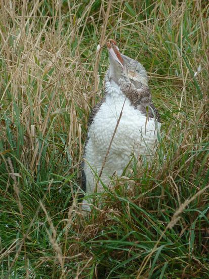 Mit mir fanden sich noch 2 andere Autos am Parkplatz beim Leutturm ein - ein neuseeländisches Ehepaar und ein alleinreisender Ami. Bei strömenden Regen machten wir uns auf und gingen den "getrammpelten" Weg entlang am Leutturm vorbei und da sah der Ami schon den ersten Pinguin im Gras versteckt. Ich hätte da nie einen Pinguin vermutet. Das neuseeländische Ehepaar war da schon sehr erfahren. Die erkannten jede Nissthöhle und wo man nach Pinguinn am Besten ausschau hällt. Als haben der Ami und ich uns dem Paar angeschlossen und eine Art Privatführung duch die Kolonie erhalten. Die anwesenden Pinguine waren alles Jungtiere, die noch nicht im Meer nach ihrem Essen jagen, sondern dieses von ihren Eltern "geliefert" bekommen. Deshalb waren die auch da und nicht drauen auf See beim Jagen und sie hatten noch Teile ihres Babyflaums an, also noch kein komplettes erwachsenen Federkleid.