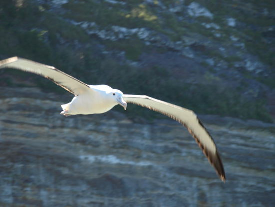 Für 14:30 Uhr konnte ich eine Tour zur Königsalbatross Kolonie buchen. Man wurde zu einem Unterstand geführt und von da aus konnte man die Vöglel beim Anflug zu ihren Küken beobachten und auch die Küken selber sehen. Leider waren keine Nester in direkter Nähe zum Unterstand, aber ich konnte gut 5 Küken beobachten. (Die kleinen brachten bei ihrer letzten Wiegung so an die 4,5 Kilogramm auf die Wage.) Ferngläser wurden zur Verfügung gestellt. Es herrschte gerade Flaute und das bedeutete, dass auch die Albatrosse nicht ihre Küken anfliegen konnten, denn sie benötigen Wind um an Höhe zu gewinnen und ihre Kolonie war nun eben mal am Head und nicht am Bottom. Aber es frischte dann doch noch etwas auf und so konnte man den riesigen Vögeln doch noch dabei zusehen, wie sie versuchten in der Nähe ihres Kükens zu landen. Es sind zwar die Könige der Lüfte, aber Landekünstler werden sie sicher keine mehr werden.
