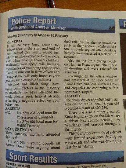 Auf meinem Weg zurück zum Hot Water Beach bin ich dann noch über meinen ersten Kiwi gestolpert (war aber nur auf einem Schild) und auch den Polizeibericht wollte ich euch auch nicht vorenthalten, sowie ein paar Impressionen auf der Strecke.