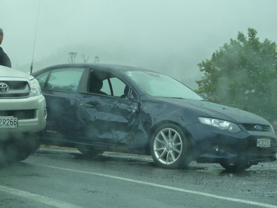 Donnerstag war dan der letzte Tag auf Coromandel und trotz guter Wetterprognose - es regnete. Also ist es jetzt nichts mehr mit meiner Wanderung zur Catheadral Cove geworden. Ich ging wieder zum Frühstücken nach Hahei, um meinen Eiervorrat für heute zu befriedigen und hoffte das es vielleicht doch noch aufreist, aber nein, es blieb ein trüber Tag. Also dann auf schnellsten Weg nach Athenree, denn da wartete ja ein Hot Mineral Pool auf mich. Da stört dann auch dieser Nieselregen nicht. Auf dem Weg ist dann genau vor mir an so einer einspurigen Brücke ein Unfall passiert. Normalerweise fährt man langsam auf so eine Brücke zu und lässt eben ein Auto durch oder fährt selber als erstes. Eine Seite ist immer zum Warten bestimmt und sollte der anderen Seite vorang geben, aber das geht nur wenn noch keiner auf der Brücke ist. Ich kam von der Seite mit Vorrang und das Fahrzeug vor mir wollte dies anscheinent durchsetzten auch wenn die Brücke schon mit nem Auto besetzte war. Das sah dann so aus: