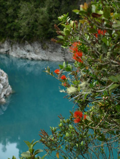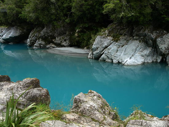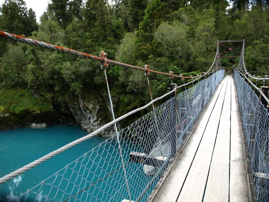 Der Himmel war zwar komplett bedeckt und es hatte leicht genießelt, aber das Blau des Hokitika Gorge kommt doch ziemlich gut auf den Fotos raus; es kam einem so vor, als wenn jemand kurz vorher blaue Wassermalfarbe in den Fluss gekippt hätte.
