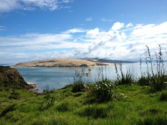 Ursprünglich wollte ich mir auch zwei kleinen Ortschaften Opononi und Omapere auf meinem Weg anschauen, aber so wirklich hatte mich nichts zum Anhalten animiert. Es standen zwar ein paar ganz nette Holzhäuser am Straßenrand, aber davon hatte ich ja jetzt doch schon einige gesehen und es war nichts mehr besonderes für mich. Kurz nach Omapere gab es aber einen Wegweiser zu einem Aussichtspunkt. Diesen hab ich dann angefahren und hatte einen wunderschönen Blick auf die Sanddünen von Niua gegenüber von Omapere.