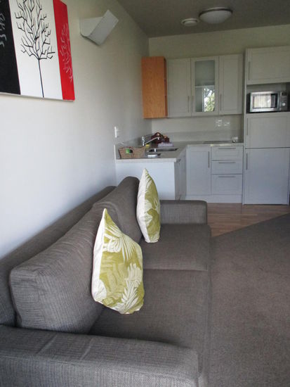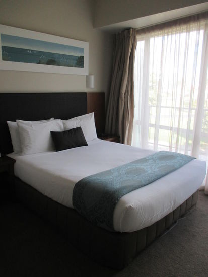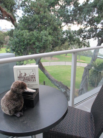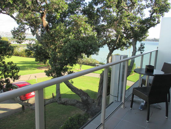 Nach meinem Museumsbesuch ging es dann schnurstracks nach Auckland weiter. Gegen 16 Uhr kam ich bei meinem Hotel an und bezog mein "Appartment", denn ich hatte ein extra Schlafzimmer und einen Wohnbereich mit Küche, Sofa und Esstisch. Zudem hatte ich eine eigene Waschmaschine mit itegrierten Trockner und einen Balkon mit Blick über den Jachthafen nach Auckland. Der Panoramablick wurde nur etwas von der Grünpflanze vor meinem Balkon getrübt - ein Baum, aber dafür hatte ich auch mein morgendliches und abdendliches Pfeifkonzert inklusive.