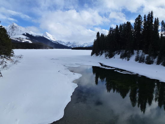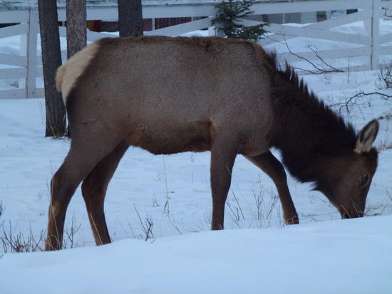 Nachdem wir am vormittag den Maligne Canyon Icewalk gemacht haben und das Wetter sehr nett wurde, sind wird entlang der Maligne Road Richtung Maligne Lake gefahren. 40 km ohne Ortschaft, Tankstelle, Haus oder vergleichbares. Schneebedeckte Straße, am Horizont immer wieder schneebedeckte Berge. Rechts und links endlose Weite des Nationalparkes. Die Fahrt ging vorbei am zugefrorenen Medicinlake und die Straße endete am Maligne Lake. Pünktlich kam die Sonne raus und setzte den See ganz besonders in den Mittelpunkt. Ich empfand es als sehr ergreifend, an diesem riesigen See zu stehen, obwohl er zugefroren ist, die Berge am Horizont.....es war einfach nur toll. Der Spaziergang am See war nicht ganz so lange, das ein doch sehr eisiger Wind ging und der nachmittag auch irgendwie wie im Fluge vergangen war. Auf den Hinweg hatten wir keine Tiere gesehen, zwar hatten wir immer wieder die Hoffnung, wenn am Straßenrand die Hinweisschilder standen, aber zunächst wurde die Hoffnung lange enttäuscht. Keine Wölfe, keine Caribous, keine Berziegen.....aber.....wir haben schon gar nicht mehr damit gerechnet....am Straßenrand ein Elch! Mein größter Wunsch: einen Elch zu sehen. Ich bin aus dem Auto und habe eine ganze Weile keine 5 Meter neben ihm gestanden, er hat friedlich an den kleinen Tannen geknabbert, dann noch ein kleiner Ausflug auf die Straße, bevor es wieder zu den leckeren Tannen ging! Ich war einfach nur happy!