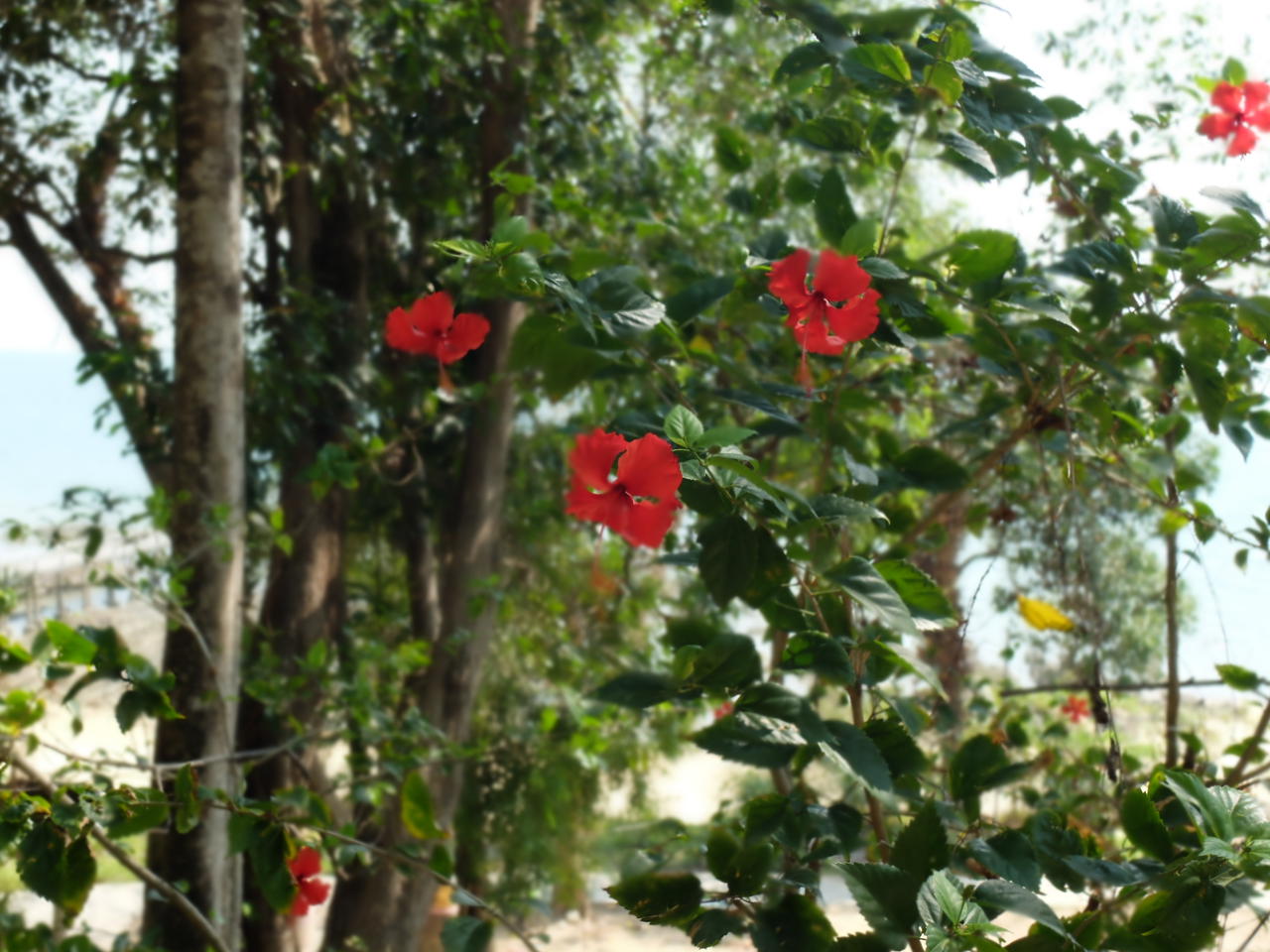 Wir sind dann erstmal zur nächsten Gasoline-Verkaufsstelle und dann zum Tempel am Pier. Der Tempel ist ziemlich einfach, aber 2 sehr große Buddhastatuen daneben geben dem Ganzen wieder eine tolle Stimmung...und dazu überall schöner roter Hibiskus...und das Meer davor...ach schön