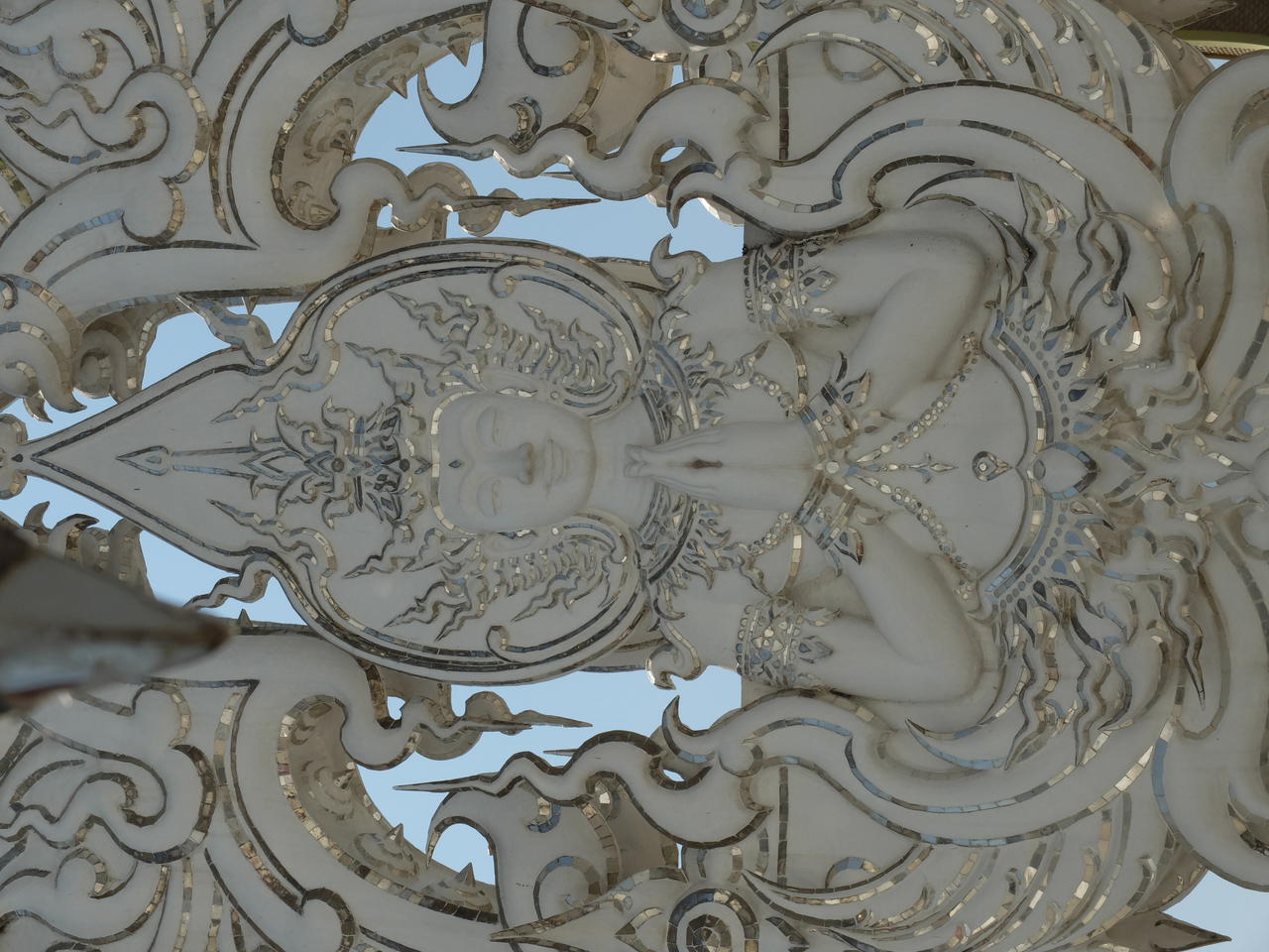 Am nächsten Tag war ich früh wach - mein neues Zimmer grenzte genau an die Küche bin dann zum Busbahnhof - Ticket für'n nächsten Tag gekauft (hatten Jarousch und ich verabredet am Abend davor, da sie auch nach Chiang Mai wollte) und dann mit dem Bus am Steig 8 zum weißen Tempel. Die Thais waren etwas irritiert, dass doch 'n Farang im Bus sitzt, aber wir waren sogar 2 - ich saß ganz hinten mit 2 sehr alten Männern - die haben sich schön gefreut. Die Dame hat auch gut die Station angesagt, aber der Tempel war ohnehin vorher schon gut zu sehen.