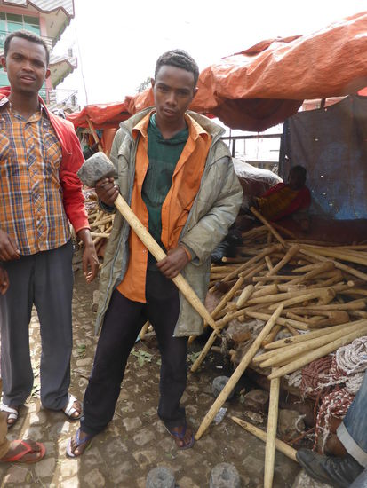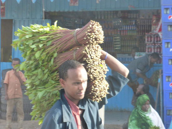 Im folgenden kleinen Ort Alemaya halten wir an, um den Khatverkäufern zuzusehen und laufen ein kleines Stück durch einen Markt mit archaischen landwirtschaftlichen Geräten - ein Verkäufer zeigt mir den Holzpflog mit aufgesetztem Steingewicht. Oder auch die geschnitzten Holzhacken zur Feldbearbeitung. Ein paar Männer sind bereits High und stopfen ein Blatt Khat hinter dem anderen ins Maul.