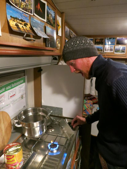 Also flugs außen am Auto die Gasflasche aufgedreht, Streichholz an die Herdplatte gehalten und...