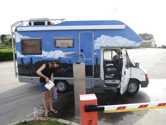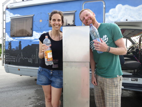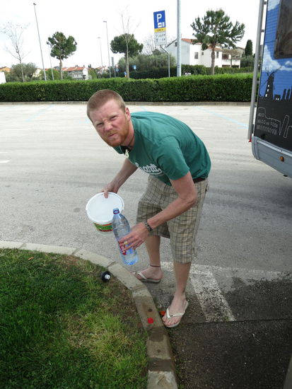 Dabei muss man die besondere Situation der Wasserversorgung in meinem Mobil vielleicht erwähnen, denn es gibt zwar eine kleine Nasszelle hinter der Fahrerkabine, in der platzlogistisch genial eingerichtet sich ein Waschbecken mit Wasserhahn und eine Toilette fuer die kleinen Geschaefte befinden. Zwischen Toilette und Klo kann man dann bei Bedarf die vollen etwa 1,35 qm ausnutzen, sich also richtig ausbreiten (also nicht die Arme, eher vertikal ausbreiten, versteht sich) und sich bei eingeschalteter Wasserpumpe aus dem herausziehbaren Wasserhahn ein Rinnsal quellfrischen Wassers ueber das Haupt traeufeln lassen. Dieses Wasser ist aus morgendlichen Motivationsgruenden natuerlich eiskalt, da das mit dem aufstehen, aufwachen und losziehen sonst ein hoffnungsloses Unterfangen waere. Diese Impro-Dusche funktioniert soweit und sogut auch, allerdings benoetigt man hierfuer naturgemaess Wasser im Wassertank und es sollte ein mehr (oder fuer manche Beteiligten eher weniger) grosser Spass werden, diesen 100 l grossen Wassertank von aussen mit Hilfe von 1,5 l-PET-Flaschen zu befuellen. Bei dieser ca. anderthalb stuendigen Arbeitsbeschaffungsmassnahme kam noch erschwerend hinzu, dass wir einen LKW-Parkplatz gefunden hatten, der zwar eine formidable Einrichtung wie eine Wassersaeule besass, diese jedoch nur 6 l am Stueck zu geben bereit war und man danach locker eine Minute warten musste, bis es neues Krahnwasser gab. Also hiess es in Akkord-Arbeit Wasser in einen Eimer bringen mit Hilfe des Knopf-Drueck-Mechanismus an unserem neuen besten Freund, der silbernen Wassersaeule, sobald das Wasser abgeschaltet war, in die PET-Flaschen umfuellen und schlussendlich seitlich in den Wassertank des Wohnmobils fuellen. Ab und zu ist einer ins Auto geklettert, um den Wasserpegel im Tank zu checken und so haben wir einen froehlichen Vormittag mit diesem neuartigen, aber sehr spannenden Hobby verbracht, uns aber dabei nicht die gute Laune nehmen lassen, nicht wahr Sarah?