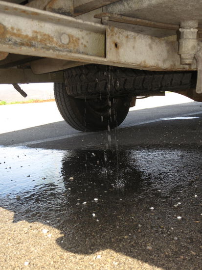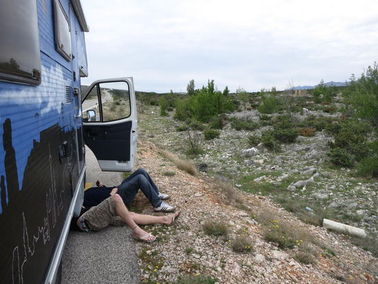 Wir fuhren also gemütlich (an den ersten und zweiten Gang bei steilen Anstiegen mittlerweile gewöhnt und Zeit sowie Nachsicht gegenüber hinter einem strandenden und sich aufregenden Verkehrsteilnehmern mitbringend) durch dieses Gebirge, als es unter uns auf einmal immer lauter zu knattern anfing. Was als normales knattern anfing, hatte sich ein paar Minuten später zu einem wilden Traktor-Sound entwickelt, so dass man sich in der Fahrerkabine nun gar nicht mehr unterhalten konnte, wenn der Fahrer Gas gegeben hat, was man ja leider tun muss, um voran zu kommen. Wir haben das Geräusch ein paar Kilometer versucht, zu ignorieren, doch als es immer schlimmer wurde, haben wir doch mal angehalten in the middle of nowhere und uns hochprofessionell mit dem Rücken auf dem Asphalt unter das Fahrzeug gerobbt (wie wir das in diversen Filmen jahrelang studiert hatten, um für den Ernstfall mit dem eigenen Auto gewappnet zu sein), um uns den Unterboden anzusehen.