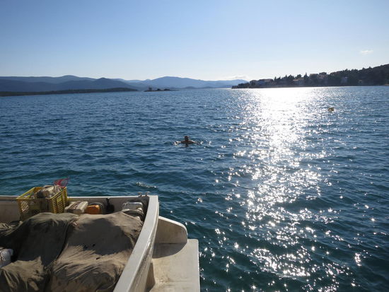 Das ließen wir uns nicht zweimal sagen,schossen so schnell es ging die gefühlt 25%-ige Steigung wieder hoch zur Schnellstraße hoch und fuhren unserer Wege... Immer noch ein wenig von Verfolgungsängsten geplagt fuhren wir erstmal locker 50,60 km die Küste entlang, bis wir ein schönes, verlassenes und völlig ausgestorbenes Dörfchen fanden, wo wir dann im eiskalten Mittelmeer erstmal die erhitzten Gemüter abgekühlt haben: