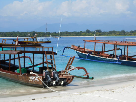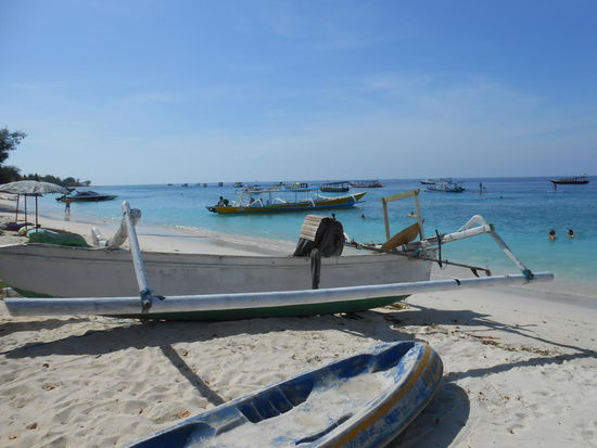 Toller Flug nach Lombok folgte. Um 7 Uhr war der Flug nach Komodo gestrichen, um halb 12 landete ich schon auf Lombok. Ich traf im Airport Transfer Flugzeug Bus eine Schweizerin. Mit ihr habe ich mir das Taxi zum Hafen in Bangsal geteilt, meine Güte, kaum in Bangsal angekommen, bin ich gleich verladen worden nach Gili Trawangan. Alle an Board, Kinder, Passagiere, Fracht und nur ein paar Meter nach Gili Trawangan.