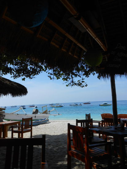 Kann ja nicht mehr viel passieren, dachte ich erleichtert, auf die nächsten Wetterereignisse in Monsterwellenform, Boot auf Schlagseite, umgekippte Fracht, ich rettete noch schnell die Eier, brechende Kinder, nasse Rucksaecke etc, konnte man sich auch gar nicht vorbereiten. Doch noch einigermaßen heile angekommen, wenn auch nass, auf Gili. Nachdem ich ein süßes Lumbung bezogen habe, wieder das Sunrise Lumbung, richtig schick, mit Couch, TV und Co fuer 300.000 IDR, ca. 25 EUR, habe ich erstmal die Schrecken des Tages in einer Beachkneipe mit einem Bintang runtergespült.