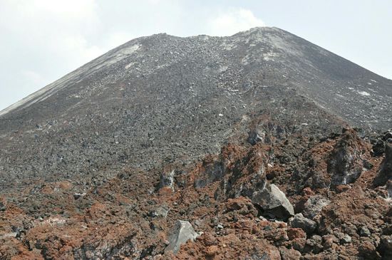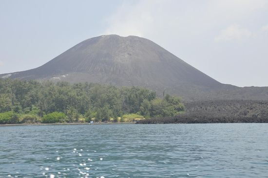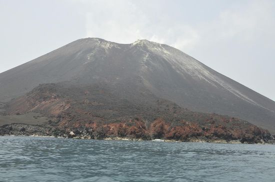 Das ist der alte Krakatau, der nur noch zur Hälfte vorhanden ist. Den steuern wir jetzt an zum schnorcheln