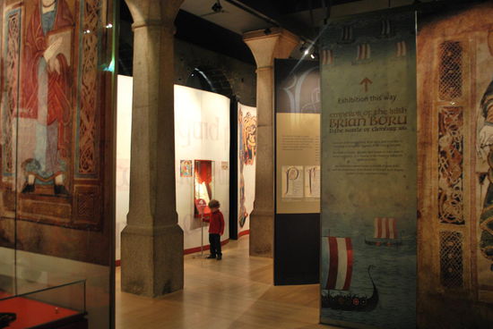 Im Schaukasten im Mittelgang sind immer ein paar Seiten des Book of Kells ausgestellt. Direkt draufhalten mit der Kamera ist nicht erlaubt.