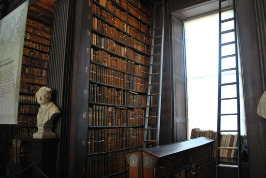 Das Trinity College wurde 1592 von Queen Elisabeth I. gegründet und hat heute ca. 16.000 Studenten. Das College beherbergt außer dem book of Kells noch weitere Sehenswürdigkeiten, die man sich auf einer Führung ansehen könnte. Ich allerdings mit meinem selbstgewählten Zeitmangel beschränke mich auf das book of Kells. Was genau das nun ist ? Ein Buch. Klar. Aber was für eines: Aufgrund der besonderen Bild- und Initialendarstellungen und seinem Alter, gehört es zum UNESCO Weltdokumentenerbe (ja, sowas gibt es auch...). Wahrscheinlich ist es um das Jahr 800 in einem schottischen Kloster entstanden und wurde wegen der damaligen Wikingerüberfälle nach Irland in Sicherheit gebracht und dort im Kloster von Kells aufbewahrt. Von dort wurde es mal gestohlen, aber wieder gefunden, wobei es irgendwie seinen goldenen Einband verloren hat. Bis 1654 verblieb es im Kloster von Kells. Danach ging es durch diverse private Hände und landete schlussendlich im 17. Jahrhundert im Trinity College. Das Buch enthält die 4 Evangelien und aufwändig verzierte Darstellungen, die mit damals teuersten Farben hergestellt wurden. Z. B. wurde das Blau aus Lapislazuli gemacht, welches damals aus Afghanistan nach Europa gelangte. Dieses Buch ist wirklich sehr wertvoll und besonders, deswegen werden nur immer 2 Seiten in einer Vitrine ausgestellt. Vielleicht muss man schon ein Büchernarr sein, um sich an diesem Anblick zu erfreuen. Aber ich bin ein eine Leseratte und es ist schon beeindruckend für mich, Seiten dieses handgeschriebenen Buches zu sehen. Speziell, weil nun auch ich inzwischen ausschließlich zum Lesen von E-Books übergegangen bin, was ich auch nicht missen möchte...