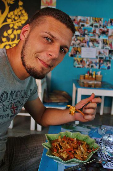 Vierter und letzter Tag in Chiang Mai. Heute Abend werden wir mit einem gemütlichen Nachtzug Richtung Bangkok schaukeln, zuvor aber gönnt sich jeder einen privaten Tag - in Marians Fall bedeutet das den Besuch eines Kochkurses und André durchstreift derweil die kleinen bunten Lädchen der Altstadt.