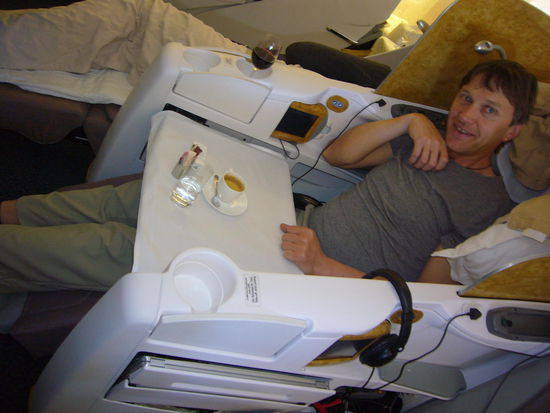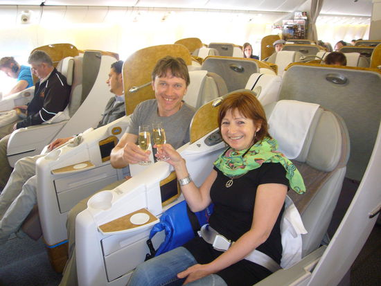 Der Mann vom Check in überreichte uns die Bordkarten mit den Worten "Buisnessclass for you". Wow! Das heißt, Transfer zum Flugzeug erst kurz vor Abflug mit eigenem Bus, natürlich nicht stehend. Dann ein Gläschen Champagner, dazu wurde eine Weinkarte, Getränkekarte und Menükarte gereicht. Und dann das Größte, der Sessel! Ein Knopfdruck macht jede Relax-Position möglich und dazu auch noch mit Massage. Zum Schlafen brachte die Flugbegleiterin noch ein Matratzerl. Da steigt man(n und Frau) auch nach 7 ½ Stunden ausgeruht aus dem Flieger .