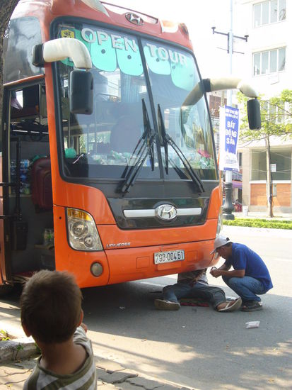 4 Stunden sollte die Fahrt mit dem Liegebus von Hoi An nach Hue dauern (140 km mit einer kurzen Pause). Preis USD 6,--/p inkl. Abholung vom Guesthouse mit einem Taxi. 6 Stunden sind es geworden. Nach ca. 40 km in Da Nang hielt der Bus vor einem Straßen-Cafe und keine Information warum. Nach ca. 10 Minuten fingen die Leute an auszusteigen und sahen, Busfahrer und Mechaniker saßen unterm Bus, da eine Panne!