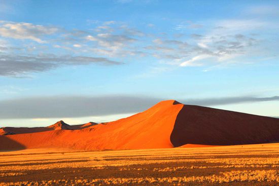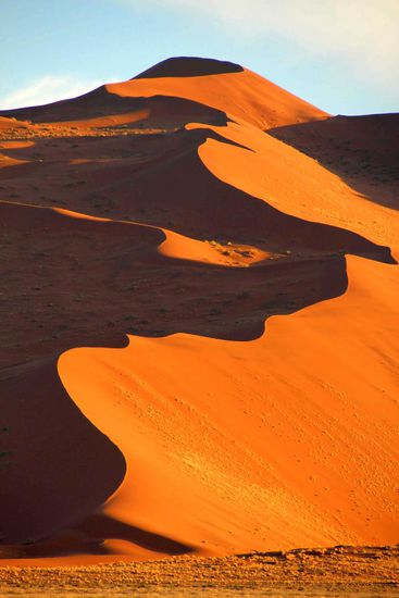 Um 5 Uhr ging der Wecker. Wir haben Samira noch so lange wie möglich schlafen lassen, aber zum Fahren mussten wir die Dachzelte abbauen. Um 6 Uhr sind wir in den Sesriemcanyon gefahren, es war noch dunkel. Zum Sonnenaufgang war auf der berühmten Düne 45 schon ziemlicher Trubel, wir haben sie deshalb lieber von der Straße aus genossen, wo wir unsere Österreicher vom Kalahari Farmhouse Camp wiedergetroffen haben. Am Ende der Teerstraße ging es in den Weichsand der 4x4-Strecke zum Sossusvlie. Da wir keinen Kompressor bekommen hatten, haben wir den Luftdruck in den Reifen so gelassen, wie er war. Mit heulendem Motor im 2. Gang und L4 haben wir es aber trotzdem geschafft, auch wenn ich zwischendurch ins Schwitzen gekommen bin. Am Parkplatz zum Dead Vlie standen schon einige Autos, deshalb sind wir zum Sossusvlie durchgefahren, wo wir fast alleine waren. Wir haben uns auf den Weg gemacht auf die Düne hinter dem Vlie, für Samira war es die erste Besteigung einer Sanddüne. Oben haben wir lange gesessen, die Landschaft im wechselnden Licht betrachtet, dem Ansturm auf das Dead Vlie und die Big Daddy Düne zugeschaut und Samira ist im Sand herumgeturnt und hat sich die Schuhe und vor allem die Socken voll Sand gefüllt und ist damit wie auf Ballons herumgelaufen. Nach 2 Stunden auf der Düne gings wieder herunter, Samira und ich haben den direkten Weg gewählt und sind die Dünenflanke heruntergerannt.