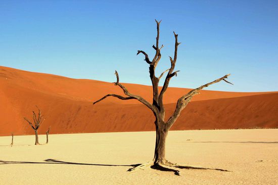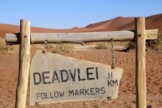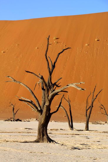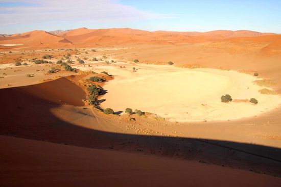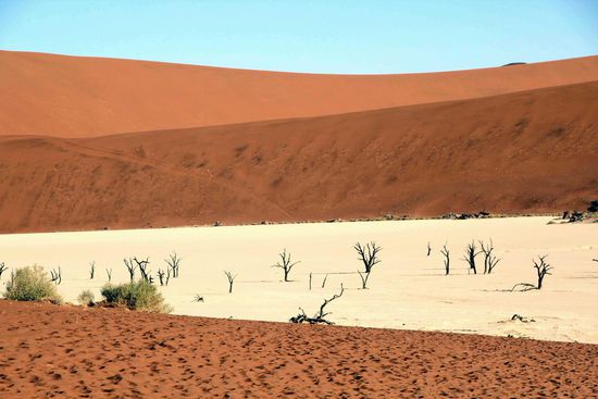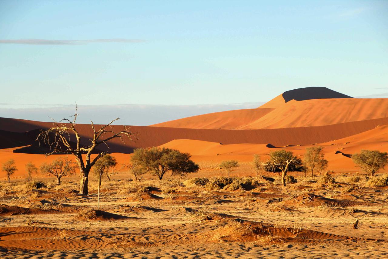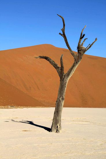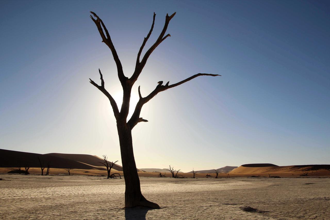 Nach einer langen Mittagspause im Schatten einer Akazie sind wir am Nachmittag zum Dead Vlie gefahren. Die Massen waren verschwunden, nur noch ein anderes Auto stand am Parkplatz. Der Weg zum Dead Vlie zog sich etwas in der Hitze, aber als die weiße Salzfläche mit den Baumgerippen plötzlich hinter der letzten Düne auftauchte, entschädigte der Anblick für jede Anstrengung. Eine Stunde lang sind wir zwischen den toten Bäumen herumgelaufen, haben immer andere Perspektiven gefunden, eine schöner als die andere und das Beste: wir waren die ganze Zeit vollkommen alleine, nur am Gipfel von Big Daddy tauchte kurz jemand auf. Die Sonne kam immer tiefer und das Licht wurde immer besser. Leider konnten wir nicht bis zum Sonnenuntergang bleiben, wir mussten uns ja noch ein gutes Stück wieder zurück durch den Weichsand kämpfen und dann noch fast eine Stunde auf Teer, damit wir rechtzeitig um 18:40 Uhr durch das innere Tor kamen.