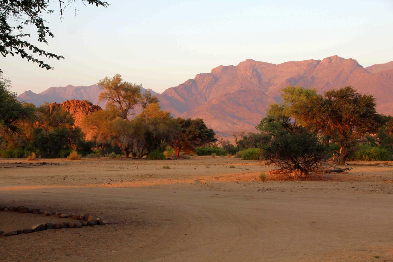 Der nächste Tag war ein Fahrtag. Wir kamen am frühen Nachmittag am Campground der Eileen-Farm an. Dort fragten wir, ob wir einen Gamedrive mitmachen könnten, aber für Camper waren keine Plätze frei. Als Alternative wurde uns das San-Living-Museum bei der Ai Aiba Lodge empfohlen. Das Camp beim Museum war schon ausgebucht, aber wir haben zwei andere Camps angeboten bekommen. Da unsere Wasservorräte zur Neige gingen, das Wasser im Tank war schon wieder wegen des heftigen Chlorgeschmacks nur zum Waschen zu gebrauchen, haben wir uns für das Camp mit Wasseranschluss entschieden. Das Wasser dort war aber leider geschmacklich sehr gewöhnungsbedürftig und nur mit großem Durst trinkbar. Dafür gab es eine schöne, an die Felsen gebaute Dusche, deren Ofen Samira gut gefeuert hat, damit uns das heiße Wasser nicht ausging.
