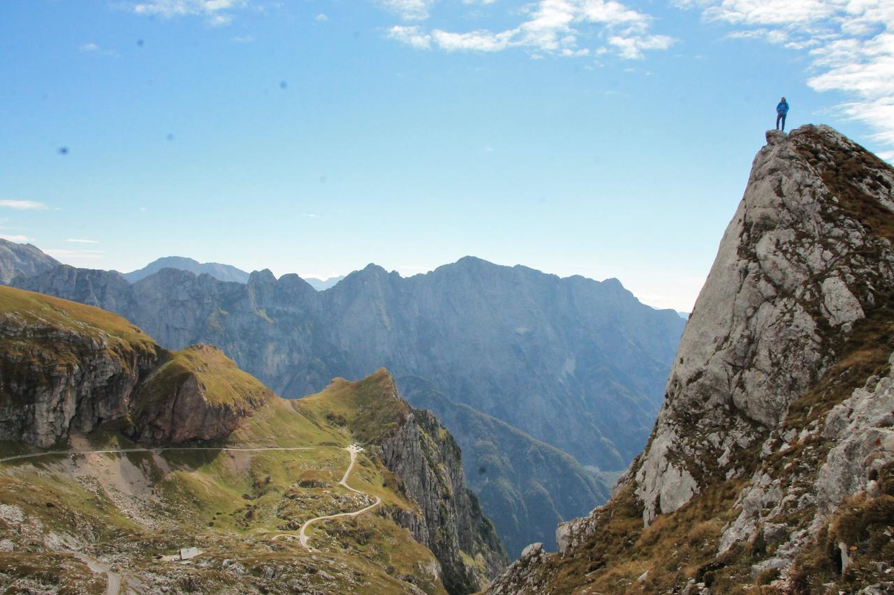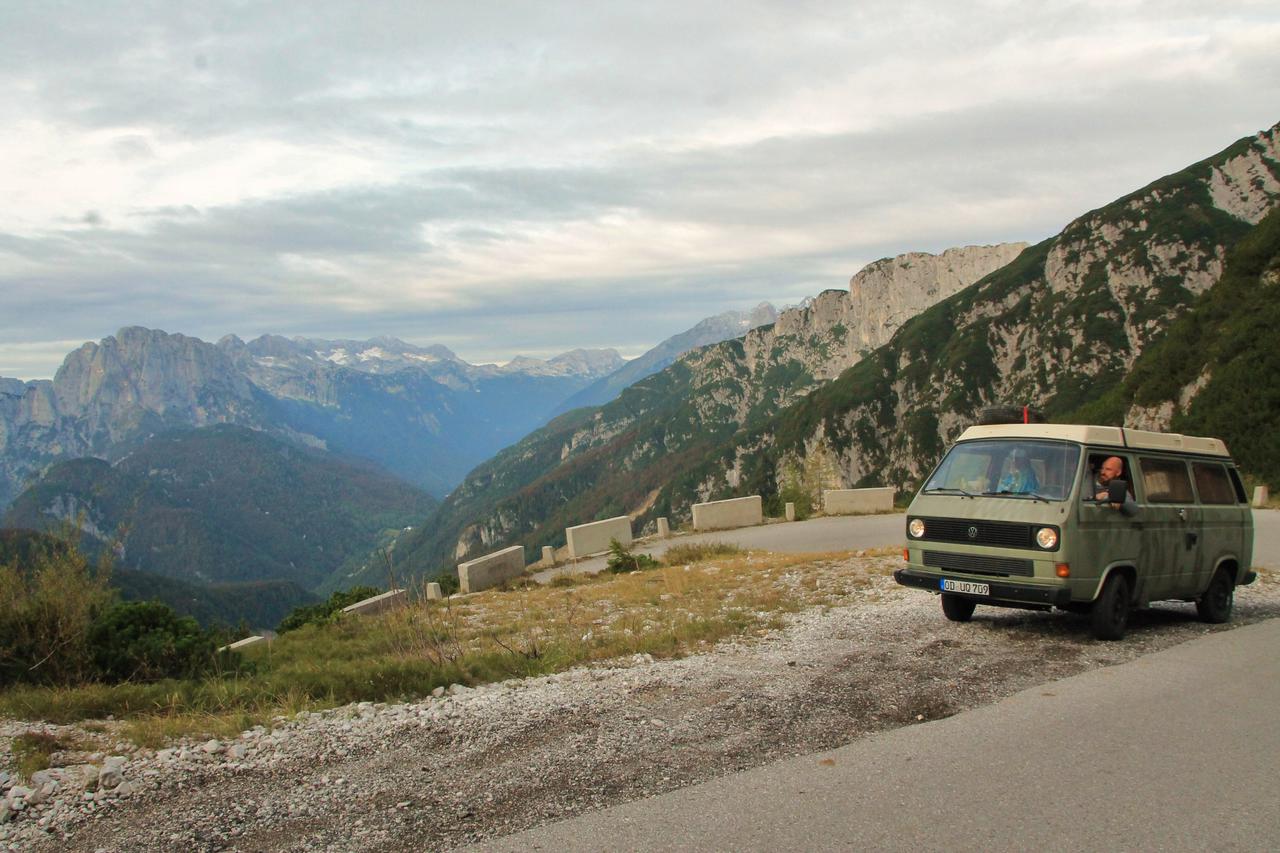 Wir schliefen in einem Tal welches auf 800hm liegt, wo der Gipfel des Mangarts schon zu sehen ist. Mit 2679hm gehört er mit zu den höchsten Bergen in den Julischen Alpen an der Grenze zwischen Slowenien und Italien. Die Wanderung beginnt auf einer Höhe von 1920m, sodass unser Bulli auch heute wieder Stärke beweisen muss. Auf der Karte ist eine Steigung von 22% eingezeichnet. Auf 12km steile Serpentinen, tuckern wir im zweiten Gang bis zum Fuße des Mangarts. Hier auf einem kleinem Parkplatz stärken wir uns mit einem ausgewogenen Frühstück und wandern eingepackt in Pullover und Windjacke, bei herbstlichen Temperaturen gegen 9 Uhr los.