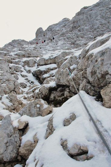 Mit Blick auf den bevorstehenden Weg, der bereits mit Metallseilen bestückt und guten 5cm Neuschnee bedeckt ist, kommen uns Zweifel. Denn auch der Gedanke an den Abstieg, welcher schon im nicht-Schneefall, nicht zu meinen Königsdisziplinen zählt, beschließen wir um zukehren.