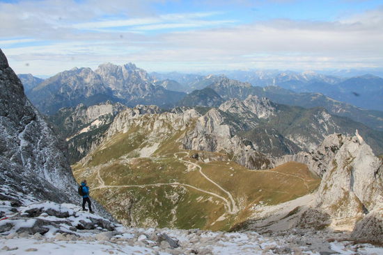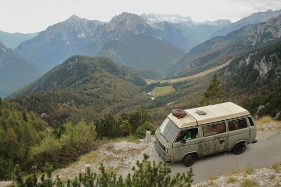 So krackseln wir auf einen der 'kleineren' Berge die sich in dieser Bergkette miteinbeziehen und stehen direkt auf der Grenze zwischen Slowenien und Italien. So naschen wir halt hier unseren Gipfelkeks, wie wir ihn nennen, bevor wir zurück zum Bulli klettern. Nun ruft die Abfahrt und Bulli's Bremsen sind gefragt. Doch auch das ist mit Zeit und Ruhe kein Problem. Auch hier säumen bunte Laubbäume den Weg ins Tal.