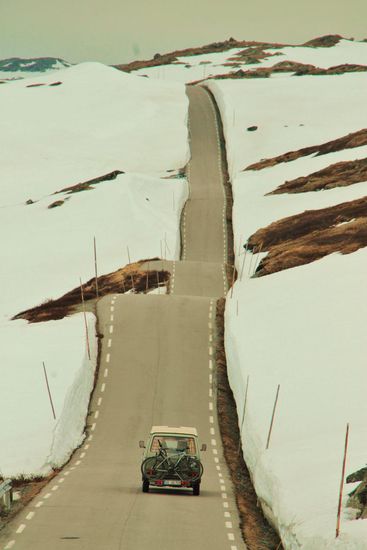 nach fünf Tagen in Lom verlassen wir das Städtchen und wollen zum größten Inlandsgletscher, dem Jostedalsbreen aufbrechen. Der Weg führt uns auf die Sognefjell Passstraße, die sich bis auf 1400 hm erstreckt. Von hier sehen wir auch die höchsten Berge Nordeuropas, den Glittertint mit 2452m sowie den Goldhoppingen mit seinen 2469m.