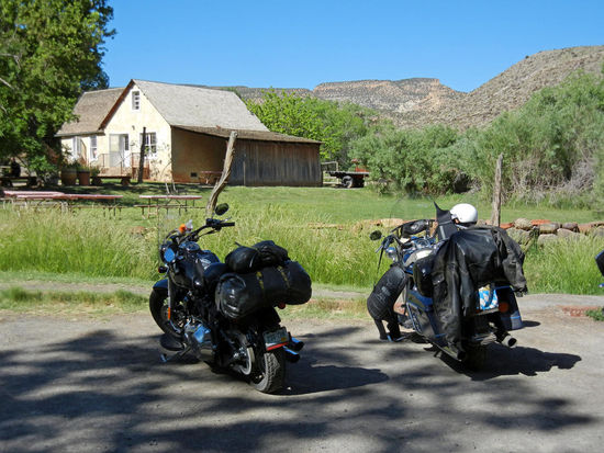 Schon um 4 Uhr sind wir wach, doch erst um 6 Uhr stehen wir auf. Um 7 Uhr treffen wir uns zum Frühstück im Hotel, danach fahren wir in den Capitol Reef National Park. Die Luft ist sehr klar und frisch und es sind noch keine anderen Leute unterwegs. So können wir die schöne Capitol Gorge allein durchfahren und halten, um zu fotografieren. Über der Straße erheben sich die schillernd gefärbten Klippen und Wölbungen des Capitol Reef, das dem Park seinen Namen gibt. Die Pioniere nannten die Felsen "reefs" (Riffe). Zwar ist es eine staubige und löchrige Schotterpiste durch die Schlucht, doch die phantastischen Farben und Felsformen entschädigen für die Mühe. Bei einem Fotostopp hat sich ein merkwürdiges Insekt auf Doris Motorrad niedergelassen. Es hat keine Lust, weiterzufliegen. Wir foto-grafieren es, später werden wir herausfinden, um welches Tier es sich handelt.