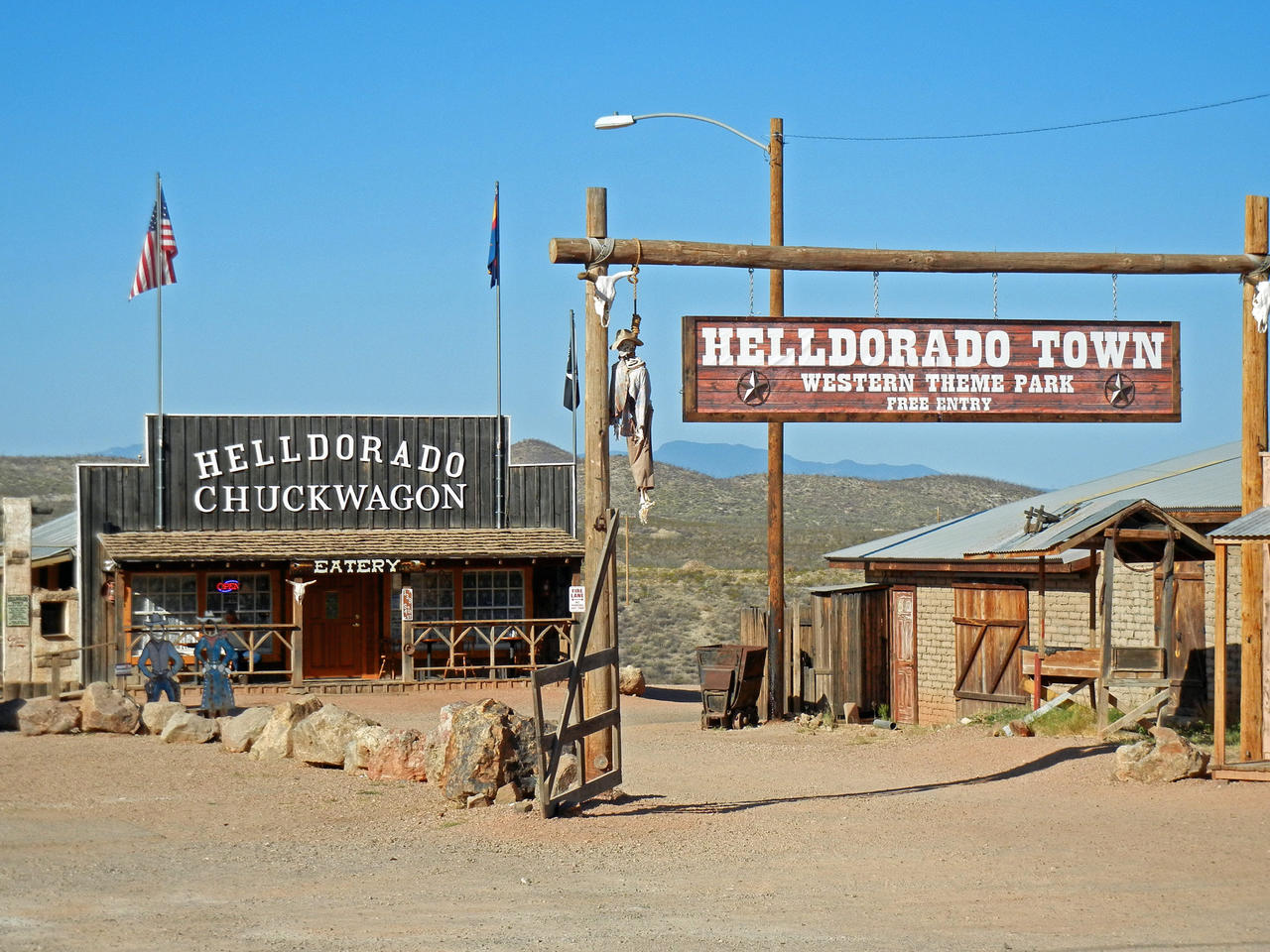 Tombstone, die wohl berühmteste Stadt des Wilden Westen, 1879 von Ed Schieffelin gegründet. Mehr als ein Jahrhundert ist vergangen, seitdem ihre Tage als Bergbaustadt zu Ende gingen, doch "The town too tough to die" (die Stadt zum Sterben zu zäh) wusste sich touristisch gut zu vermarkten. Mit ihren staubigen Straßen, hölzernen Gehwegen und schwingenden Saloontüren ist sie überraschend unverändert geblieben. 1877 als Silberminen-Boomtown entstanden, zählte sie auf dem Höhepunkt ihrer Berühmtheit mehr als 10.000 Einwohner, aber 1890 war sie bereits wieder von fast allen verlassen. Die meisten der Gebäude sind aus den frühen 80er des 19. Jh.. Das berühmte "Bird Cage Theater" ist immer wieder sehenswert. Sieben abgeschirmte Vogelkäfige, die früher angeblich von Prostituierten benutzt wurden, hängen zu beiden Seiten der Haupthalle herab. Das Theater beherbergt eine wilde Kuriositätensammlung und eine Treppe tiefer kann man die alten Spieltische und Bordellzimmer bewundern.