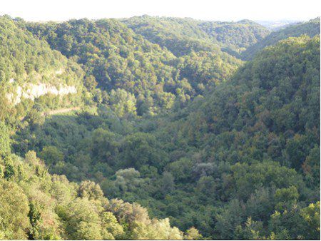 Nun geht es bereits wieder zurück Richtung Rom. Doch vorher machen wir noch einen Abstecher nach Mazzano und in das wilde, urwüchsige und als Naturschutzgebiet ausgewiesene Treia-Tal. Wir besuchen das Dorf Calcata, das auf einem Plateau im Treia-Tal thront. Das einstmals fast vollständig verlassene Dorf dient heute vielen Aussteigern als neue Heimat und hat mit seinen Kunsthandwerksläden, Bars und Restaurants beinahe Kultstatus. Wir parken weit oberhalb auf einem groß angelegten Parkplatz und wandern zu Fuß hinunter zum Stadtportal, vorbei an in den Tuffstein gearbeiteten etruskischen Gräbern, die jetzt als Autoabstellplätze dienen.