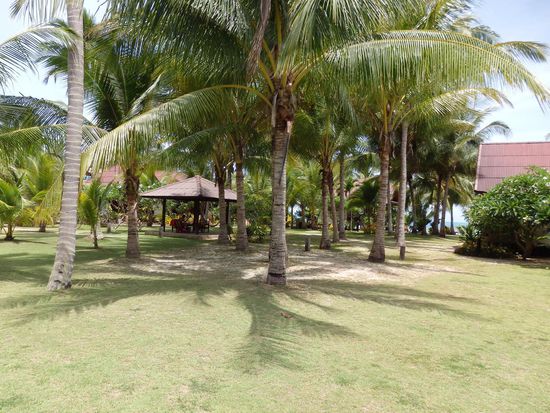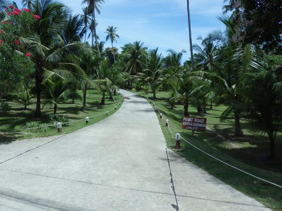 An der Hauptstraße führte ein wunderschöner Weg in die Anlage zwischen vielen Palmen hindurch. Als wir in Höhe der Rezeption waren, kam uns schon eine Frau entgegen und wir fragten, ob sie noch was frei hätte. Sie zeigte uns einen Bungalow, direkt in der vordersten Reihe zum Strand. Als sie dann noch sagte, dass es 1000 Bt die Nacht kostet, haben wir gleich eingewilligt. Sie hätte es uns bestimmt auch noch für weniger gegeben, wenn wir es versucht hätten. Außer uns sind nur 2 Mädels aus der Schweiz da, sonst ist es hier komplett leer.
