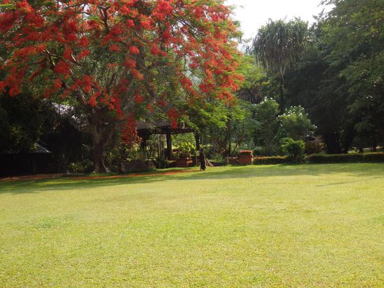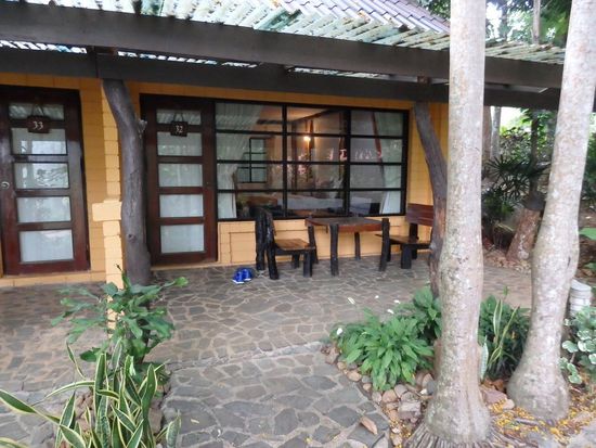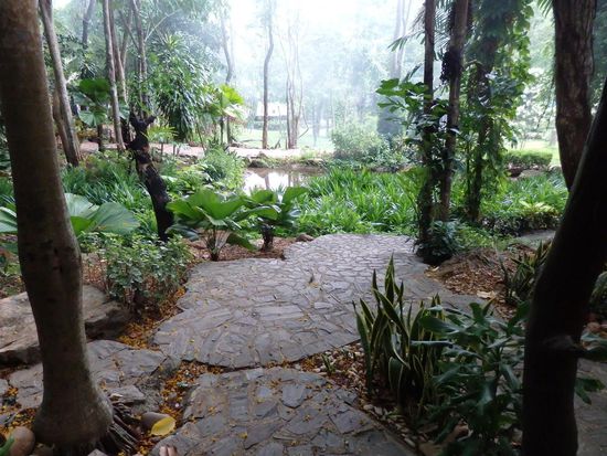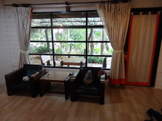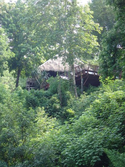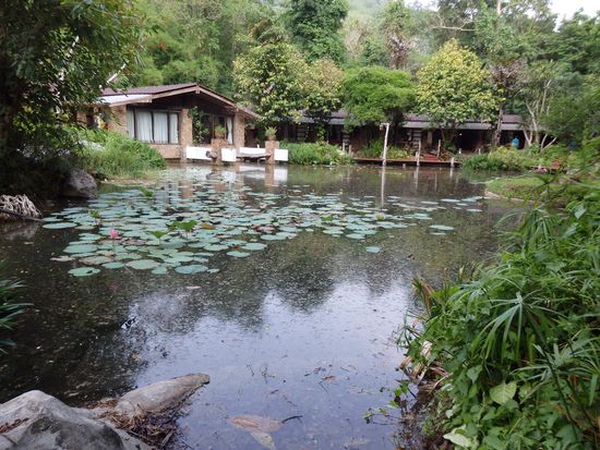 Das Resort ist ca. 20 km von der Endstation Nam Tok entfernt. Da wir keine Ahnung hatten, wie weit es wirklich ist und wir nun schon fast 6 Stunden in der Holzklasse unterwegs waren, haben wir uns ein Taxi für 500 Bt geleistet. Verhandlungsbeginn war 700 Bt. Egal wir wollten endlich ankommen. Im klimatisiertem Taxi fuhren wir, gottseidank bis ins Resort hinein, weil dieses ca. 1 km im Dschungel von der Straße weg war. Also der Busfahrer hätte uns da nicht hingefahren. Der Eingangsbereich war wunderschön, überdacht, aber ringsherum alles offen, Palmen, Blumen, riesige Bäume, idyllisch und schön. Einen leckeren Willkommenstee mit Eis haben wir beim check in erhalten. Ein Angestellter hat unsere Rucksäcke ins Zimmer getragen. Unser Zimmer lag schattig kühl, ein wenig auf einer Anhöhe, mit einem Teich davor und einem Teich dahinter.