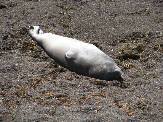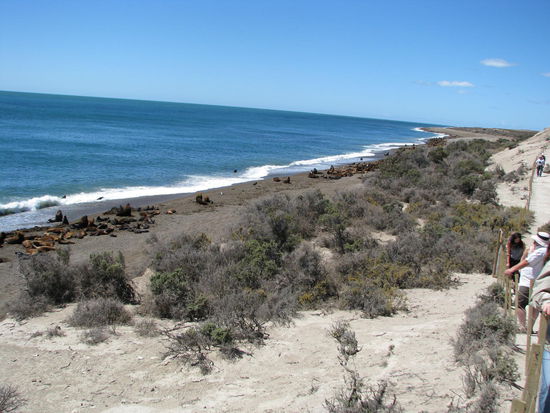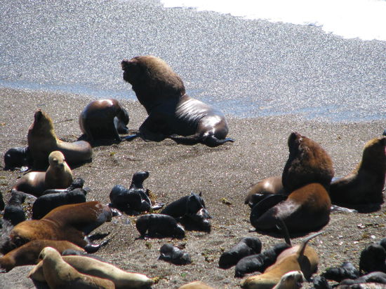 Wir fahren weiter (auf Valdes wieder v. a. Schotterpisten) nacht Punta norte, wo eine große Kolonie von Seelöwen und Seeelefanten zu sehen ist. Vor wenigen Wochen haben die Kühe der Seelöwen gekalbt und sich gleich wieder um Nachschub gekümmert. Die Orcas kommen erst Mitte Februar, dann geben sie ein außerordentliches Schauspiel, weil sie hier sich wie sonst nirgends bis an den Strand spülen lassen, um die Kleinen zu schnappen. Aber schon die Nähe zu den beiden Robbenarten, die hier gemischt am Strand leben, ist toll. Wir stehen auf den Klippen oberhalb des Strandes und sehen die kleinen Robben spielen, die Tiere schwimmen, an Land relaxen oder das Familienleben und auch Kämpfe zwischen Bullen.