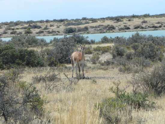 Danach dusche ich im Hostel (was der Chef ausdrücklich angeboten hatte) und gehe zum Busterminal. Obwohl die Sonne schon recht tief steht scheint sie noch kräftig und nach dem Sonnenbaden suche ich mir ein schattiges Plätzchen, damit ich mich nicht nochmal eincremen muß. Mit 10 Minuten Verspätung kommt der Bus, ich sitze oben ganz vorne, wie bei praktisch allen sind große Sprünge in der Frontscheibe; allmählich wird mir bei der Fahrweise bewusst, daß mein Platz ggf. sehr ungünstig ist, wenn die Scheibe reißen sollte: der Fahrer überholt zwar nicht recht riskant, fährt aber z. B. auf einen beladenen (rot beflaggten) Bhutanlaster so dicht auf, daß ich den unteren Teil des Tanks nicht mehr sehe. Mir fällt auf, daß mein Ticket und mein Ausweis im Bus nicht mehr kontrolliert und aufgeschrieben werden - ist meine erste Überlandfahrt mit einem argentinischen Bus. Es wird schon deutlich früher dunkel, um zehn endet das Videoprogramm und die Lichter gehen aus, um halb elf steigen nochmal viele zu und erst nach elf Uhr halten wir dann noch über 40 Minuten zum Abendessen. Da ein vorhin zugestiegenes Kind laut ist nehme ich einen Wein als Schlummertrunk. Der Balg ist für mich mal wieder ein Beleg, wie penetrant doof Kleinkinder sein können: mal wiederholt er innerhalb von fünf Minuten hunderte Male eine spanische Phrase, dann singt er minutenlang englische Wörter, die er (hoffentlich) nicht versteht: "I love money". Soweit ich es mitbekomme, sind sogar die Argentinier um ihn herum genervt und versuchen, auf ihn bzw. auf die Eltern einzuwirken. Da ist mir das kurz quengelige jüngere Mädchen in der ersten Reihe noch lieber. In der Pampa stehen weiterhin Guanakos.