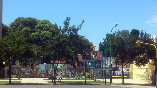 Ich fahre in den südlichen Stadtteil La Boca, früher Hafen- und jetzt Arbeiterviertel, aber auch Heimat des berühmten Fußballclubs. Bekannt geworden ist es u. a. durch die farbigen Häuser: hier haben die Hafenarbeiter den übrige Schiffslack verwendet. Mittlerweile sind auch Bilder eines "Hafen-Malers" professionell an öffentlichen Gebäuden hier (natürlich gibt es auch Graffitti). Ich steige etwas vor dem touristischen Zentrum aus und sehe erstmal verfallene Bankpaläste. Das Zentrum Caminato (sprich Fußweg, überwiegend Fußgängerzone) ist dann recht modern, es gibt ähnlich wie im Viertel Lavalle größere eingeschossige Einkaufszentren mit offenen Läden, auch Edelshops mit Halbedelsteinen und so. Samstags sind viel Touristen unterwegs und in den etwa ein Dutzend Straßen sehe ich ca. 10 Polizisten; Touristen werden von scheinbar professionellen Tangotänzern dazu animiert, sich kostümiert mit ihnen in Pose fotografieren zu lassen.