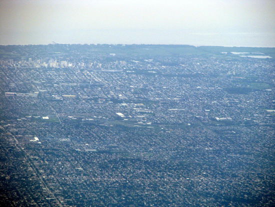 Ich gehe zum Hafen, will mich über die Schiffe nach Uruguay informieren. Leider existiert die Überquerung oder Unterführung der Gleise nahe dem Bahnhof Retiro nicht mehr, die nächste Brücke gehört zu einer Autobahn, also gehe ich weiter nach Norden - mir ist später nicht mehr ganz klar, wie ich gelaufen bin, aber zum Hafen wäre es über den Bahnhof sicher sehr viel kürzer gewesen. Wegen des starken Verkehrs setze ich den in Cordoba gekauften Nasen-/Mundschutz auf. Teilweise steht das Wasser auf dem Gehweg und im Rinnstein, dementsprechend zahlreich sind die Mücken, in wenigen Minuten erschlage ich alleine auf meiner Hose Dutzende von ihnen - ich frage mich mal wieder, wie es zu der Legende kam, daß helle Kleidung Moskitos abhält. Als die Straße dann endlich die Bahngleise überquert verwandelt sie sich in eine Art Highway: sechs Spuren und der Gehweg wird immer kümmerlicher. Ich glaube, meinen Augen nicht zu trauen als ich dann "Aeroparque" lese und Flugzeuge abheben sehe, aber der Inlandsflughafen ist tatsächlich sehr zentral. Von hier ist es noch etwa ein Kilometer durch ein Industriegebiet mit viel Lkw-Verkehr zum Hafen. Es ist fast 19 Uhr, als ich schließlich den Rand des Hafens erreiche, am nördlichen Ende angeln einige Männer und am Straßenrand parken bereits viele Laster, die Fahrer kochen sich Abendessen und die meisten sind wohl einfach froh, sich erholen zu können. Es dämmert schon langsam und die Atmospäre ist mir nicht ganz geheuer, obwohl man sich mit manchem Fahrer vermutlich auch gut unterhalten könnte. Hier wird noch nicht verladen, im Wasser liegen einige große Schiffe und verrostete Kähne, angesichts der Tageszeit gehe ich aber dann doch landeinwärts.