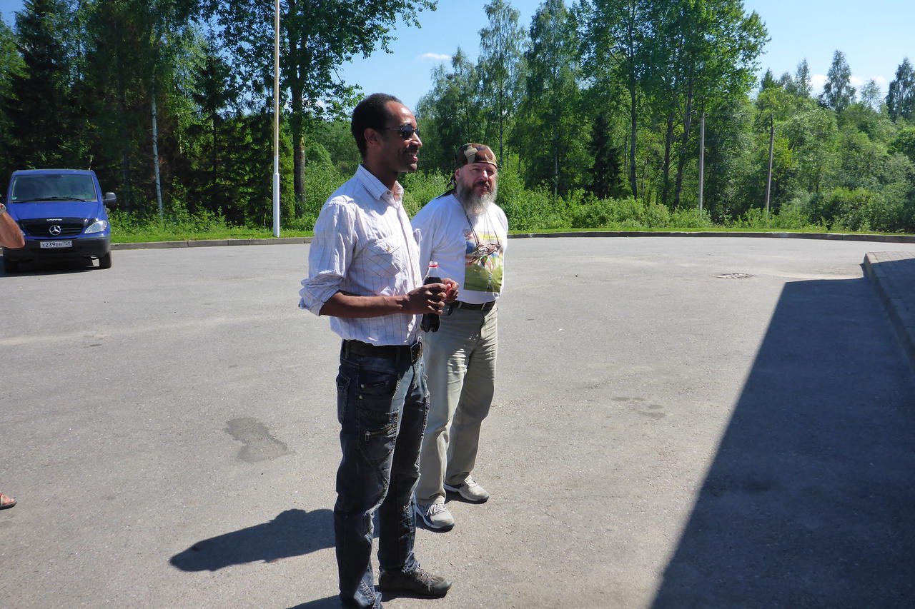 Nach erfolgreicher Passage der estnisch-russischen Grenze werden wir von Sergej (rechts von Arthur, einer unserer Tourguides) begrüßt. Die Grenzkontrollen liefen zügig und korrekt ab, mein Fahrzeug wurde von zwei russischen Grenzbeamten unabhängig voneinander inspiziert, die Ausstattung des HZJ 78 interessierte sie und schien ihnen zu gefallen. Die Kontrollen bei der Ausreise an der estnischen Grenze der EU dauerten genauso lange wie die bei der Einreise an der russischen, jeweils etwa 1,5 Stunden. Jetzt bewegen wir uns außerhalb des Schengenraums, zunächst noch bis zum Ural in Europa.