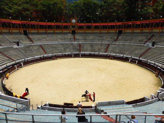 Weiterhin lernen wir wie eine Zuckerrohrpresse funktioniert und wie köstlich der so produzierte Saft schmeckt, besuchen einen Obstmarkt mit Kostproben der einheimischen Früchte wie Guanabana oder Borojo, Namen die ich noch nie gehört habe und die ich entsprechend im heimischen REWE Markt auf ewig vergeblich suchen werde, sehen das Training eines angehenden Torreros in der alten Stierkampfarena, fahren durchs Rotlichtviertel (es fängt an zu regnen und von den Arbeitsschaffenden ist weit und breit nichts zu sehen) und besuchen eine kleine, aber feine und angeblich Kaffee in Spitzenqualität produzierende Kaffeerösterei nebst Verköstigung.